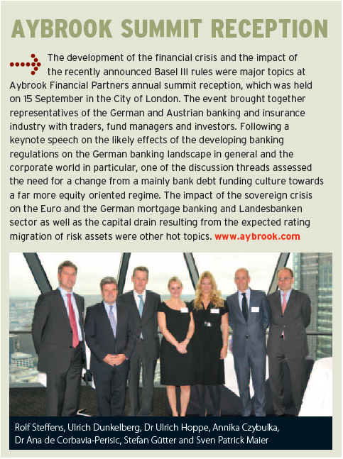 The development of the financial crisis and the impact of the recently announced Basel III rules were major topics at Aybrook Financial Partners annual summit reception, which was held on 15 September in the City of London. the event brought together representatives of the German and Austrian banking and insurance industry with traders, fund managers and investors. Following a keynote speech on the likely effects of the developing banking regulations on the German banking landscape in general and the corporate world in particular, one of the discussion threads assessed the need for a change from the mainly bank dept funding culture towards a far more equity oriented regime. the impact of the sovereign crisis on the Euro and the German mortgage banking and Landesbanken sector as well as the capital dray resulting from the expected rating migration of risk assets were other hot topics.